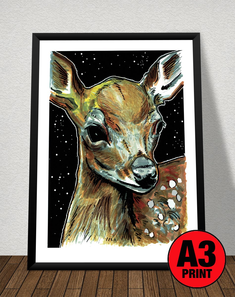 Deer At Night Art Print Signed A3 Size (16" x 12")